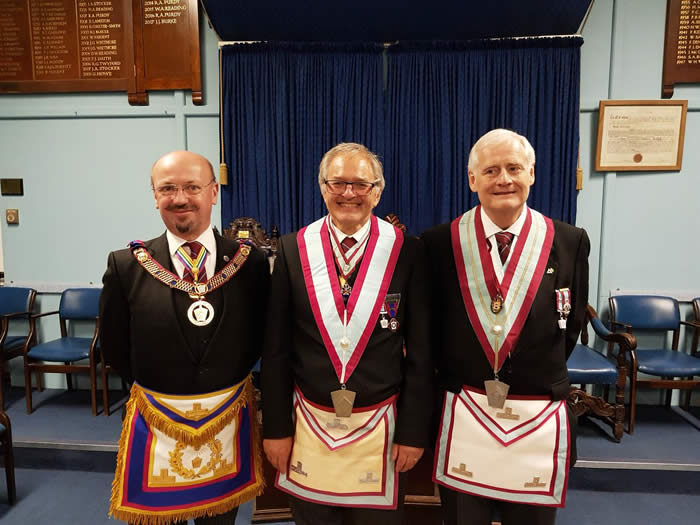 W.Bro. Steve Field Installed Bro. Paul Lyden as his successor at Valentia Lodge of MMM No. 623 on Wednesday 23rd October 2018. Both pictured with Deputy Provincial Grand Master, V.W.Bro. Graham Seeman, P.G.J.O.