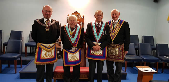 At Conrad Costin Mark Lodge of MMM No. 1430 on Tuesday 26th February 2019, W.Bro. Ian Blundell was Installed by W.Bro. Robin Gibson. R.W.Bro. Dr Ewan Page, P.P.G.M. delivered the Address to the Master and explained the Keystone jewel. All pictured with V.W.Bro. Graham Seeman, P.G.J.O., Dep.P.G.M.