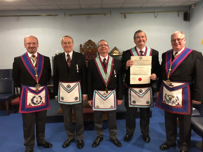 The Provincial Grand Master, RW Bro Richard John Olliver, GMRAC and the Deputy Provincial Grand Master, VW Bro Graham David Seeman, PGJO, were present at their own Lodge on Tuesday 16th January 2018 to witness the Advancement of Bro Roger Tomlinson (2nd from left). Bro Roger and VW Bro Graham met when the Craft Provincial Choir was formed, Graham obviously managed to convince Roger of what he was missing by not being a member of the Mark Degree and so he was Advanced after 23 years as a Mason. Bro Roger thoroughly enjoyed the ceremony which was conducted in an excellent manner by the Worshipful Master, W Bro Bob Marchbanks (middle), stating that he wished he had joined earlier.