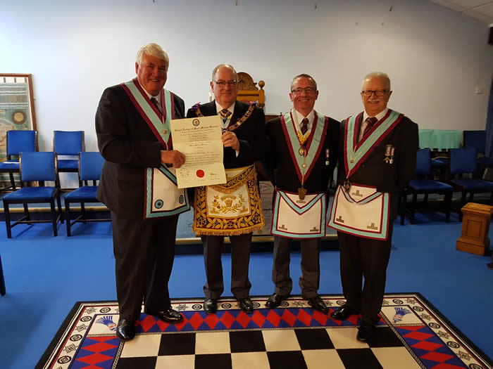 The Provincial Grand Master, RW Bro Richard John Olliver, GMRAC was at his own Mark Lodge on Tuesday 21st November 2017 to witness W Bro Don Grant (far Right) Install Bro Bob Marchbanks (2nd from Right) into the chair of Adorniram in a most sincere and excellent manner. Before this however the PGM was delighted to present a Grand Lodge Certificate to Bro John Newman (far left).