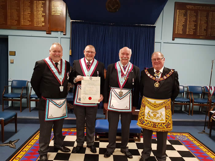 After a period of two years as the Master of Linden Acre Lodge of MMM No. 1568 W.Bro. Graham Parker installed Bro. Ian Dixon Osborne as the Worshipful Master. Once Installed W.Bro. Ian appointed and invested his officers amongst whom was Bro. Stephen Heike (Steward) who joined the Lodge on the same evening. Bro. Steve was Advanced into the degree at Temple of Uxbridge Lodge No. 1393 in the Province of Middlesex on 21st February 2003 but unfortunately didn’t receive his Grand Lodge Certificate before he left the Lodge. This was rectified when the Provincial Grand Master took great pleasure in not only welcoming Bro. Steve back into the fold of Mark Masonry but also presented him with his certificate from some 18 years before.