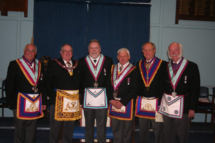 The Provincial Grand Master, RW Bro Richard Olliver visited Linden Acre Lodge of MMM No. 1568 on Tuesday 11th October 2016 to witness W Bro Graham Parker (3rd from left) be Installed as Worshipful Master by W Bro David Medley (3rd from right). It was done in David’s own style, with sincerity and humour and all present had an enjoyable evening.