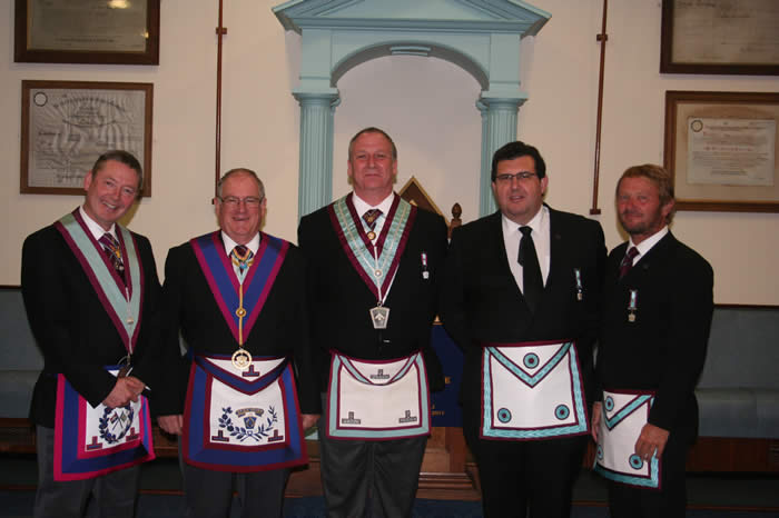 On this occasion he witnessed the Advancement of Bro David Whyatt (2nd from right) with the ceremony being conducted by both the Worshipful Master, W Bro Graham Reynolds (centre) and W Bro Jim Payen (first from left). Bro David was proposed into the Lodge by Bro Mark Wiltshire (far right) and seconded by W Bro Graham Reynolds.