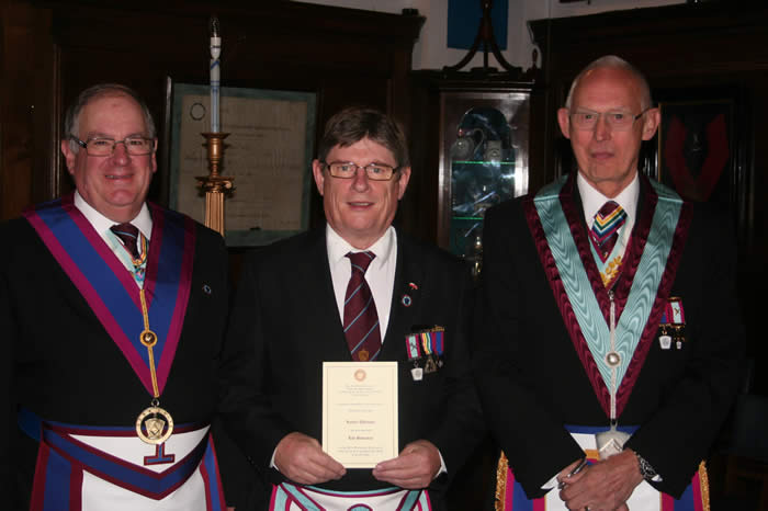 Before the presentation however he presented Bro Bob Atkinson (centre) with the jewel of a Life Governor of the Mark Benevolent Fund. He thanked Bro Bob on his own behalf and that of the Mark Benevolent Fund for his generosity.