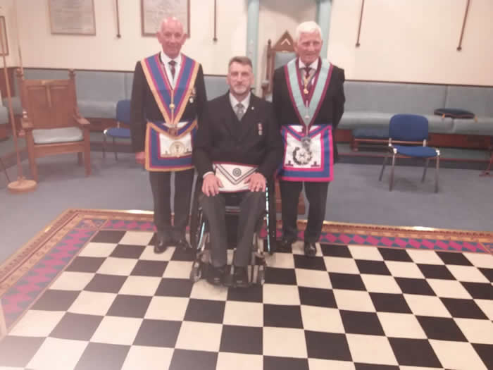 The advancement of Bro. Neil Wilkinson was carried out in a most successful manner by W.Bro. Pat Leonard, Worshipful Master, together with his officers. Bro. Neil is seen here above with on his right W.Bro. Bob Watson, Prov.G.M.O., the P.G.M.’s representative and on his left W.Bro. Pat Leonard, Worshipful Master.
