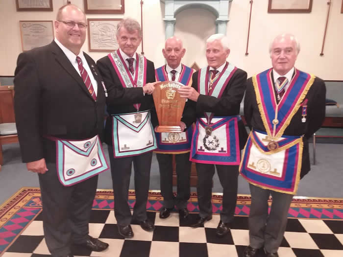 The Provincial Travelling Keystone was transferred to the Hungerford Lodge of MMM No. 1342 in a very professional manner by the Worshipful Master of Erlegh Lodge of MMM No. 1627 W.Bro. Douglas Marlow (2nd left). He was accompanied by four members of the Lodge, Bro. Ian Wharton (1st left) and W.Bro. Silverio Ostrwoski (Secretary) (far right) ,missing from the photo is W.Bro. Tony Hardiman.