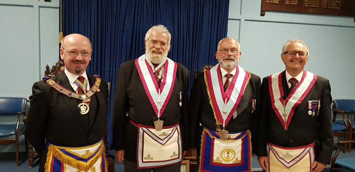 Pictured are (l to r) V.W.Bro. Graham Seeman, Dep.P.G.M.; W.Bro. Andy Blatchford, Worshipful Master; W.Bro. David Barber, Installing Master and W.Bro. Paul Lyden, the outgoing Master.