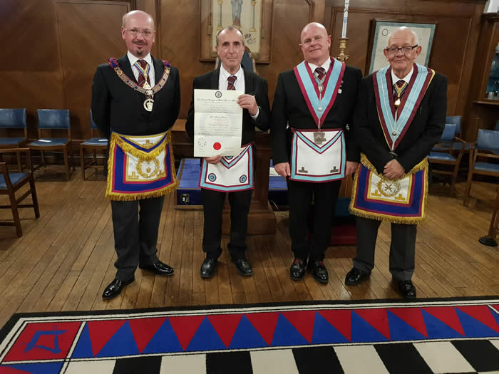The Dep.P.G.M. presented the lodge with a special jewel to mark its achievement of becoming a Grand Patron Diamond Award of the Mark Benevolent Fund and he also presented a Grand Lodge Certificate to Bro. Donald Pether.