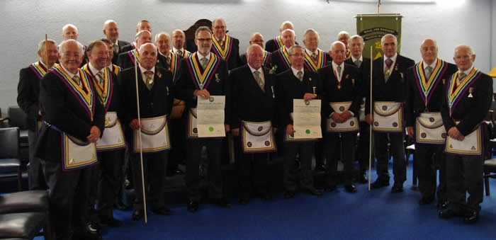 The Lodge conducted an Elevation ceremony when Bro Steven Young (middle front row) was Elevated by the Worshipful Commander, W Bro Alan Bell and his officers in a most sincere manner. The PGM also presented Grand Lodge Certificates to Bro’s Bob Marchbanks (on right of Steven Young) and Andy Basham (on left of Steven Young).