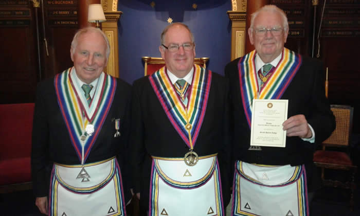 What a delightful evening it was, firstly the PGM (centre) was able to present to the Lodge the collarette of a Grand Patron of the Mark Benevolent Fund (certificate being held by W Bro David Fisher), secondly being able to present Bro Simon Burt with his Grand Lodge Certificate, thirdly seeing W Bro Graham Giddings (left) attain the chair of the Lodge and lastly by being presented with a further cheque of £500 from the Lodge to the 2017 Festival.